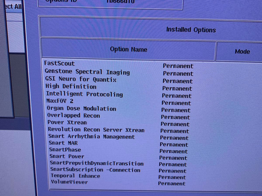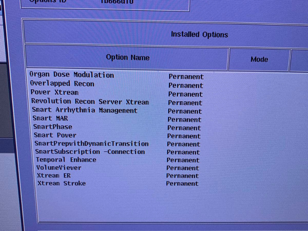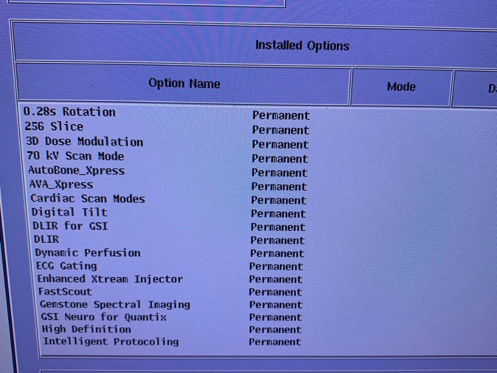 • SW options console: 0.28s Rotation, 256 Slice, 3D Dose Modulation, 70 kV Scan Mode, AutoBone_Xpress, AVA_Xpress, Cardiac Scan Modes, Digital Tilt, DLIR for GSI, DLIR, Dynamic Perfusion, ECG Gating, Enhanced Xtream Injector, FastScout, Gemstone Spectral Imaging, GSI Neuro for Quantix, High Definition, Intelligent Protocoling, MaxFOV 2, Organ Dose Modulation, Overlapped Recon, Power Xtream, Revolution Recon Server Xtream, Smart Arrhythmia Management, Smart HAR, SmartPhase, Smart Power, SmartPrepwithDynamicTransition, SmartSubscription -Connection, Temporal Enhance, VolumeViewer, Xtream ER, Xtream Stroke