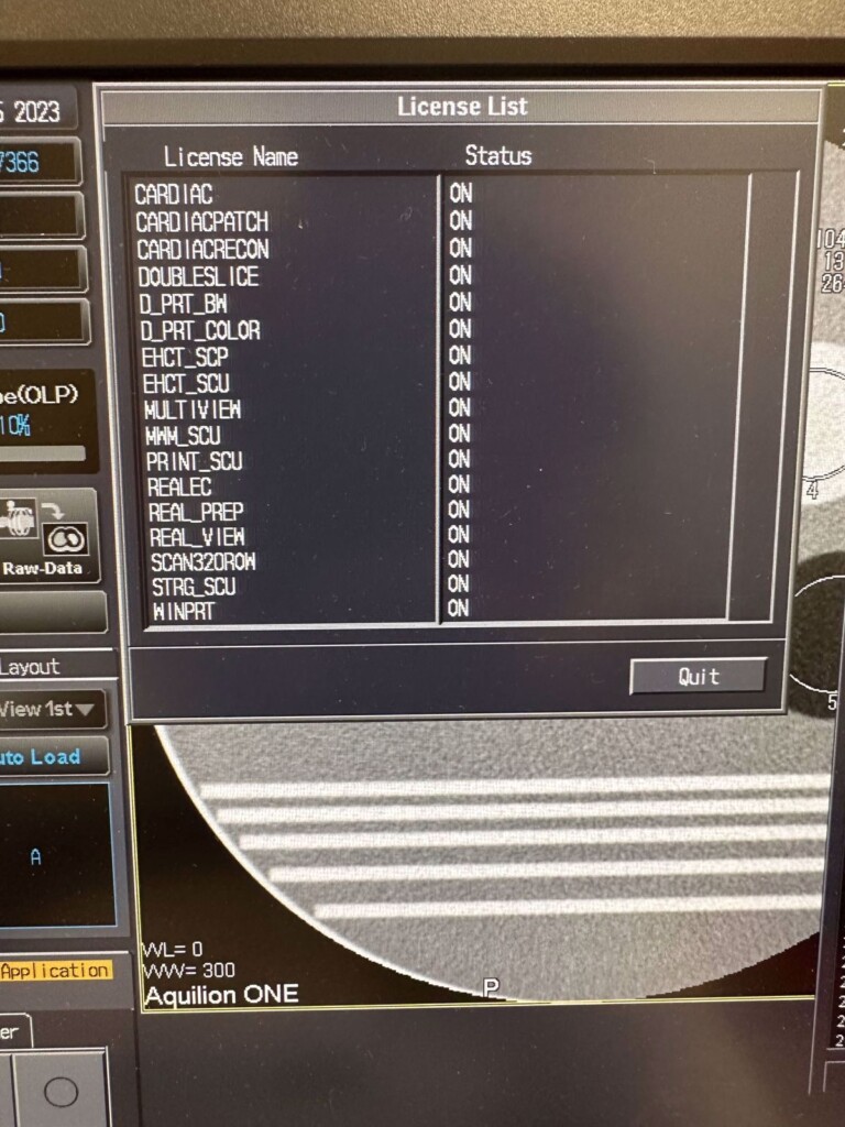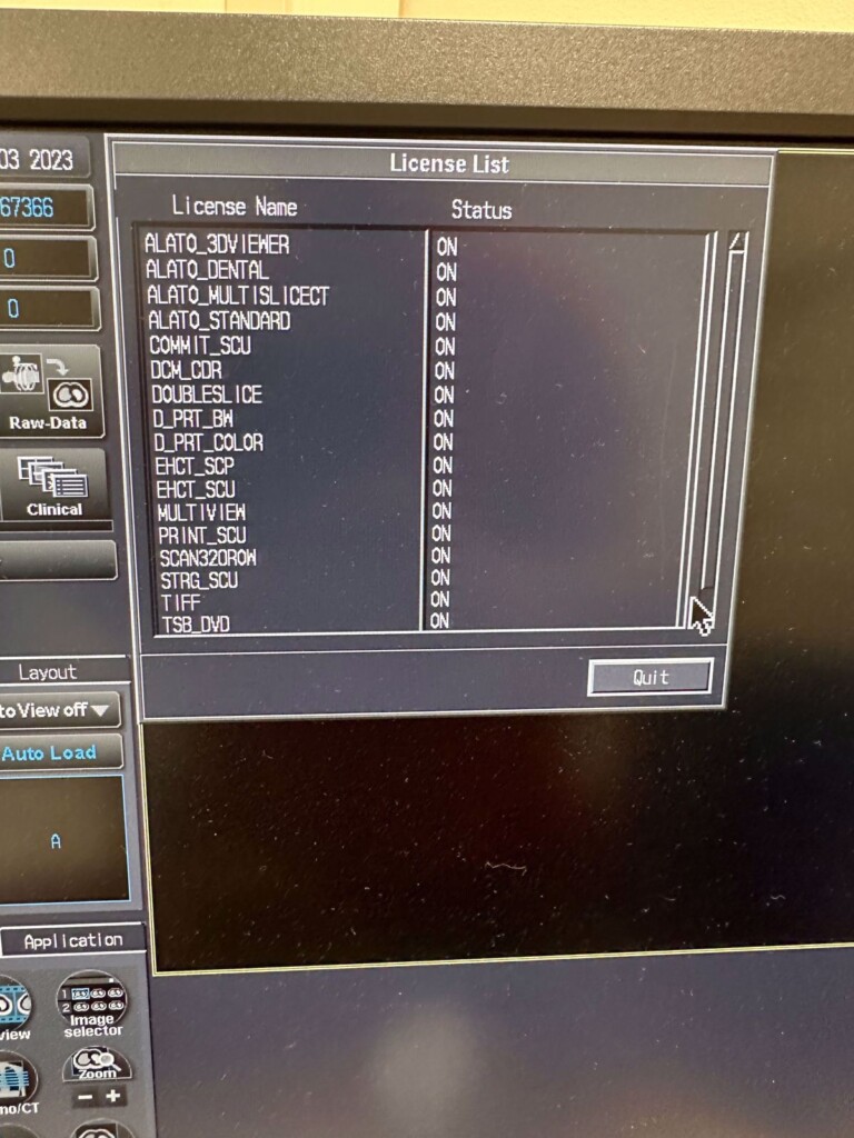 SW options console: CARDIAC, CARDIACPATCH, CARDIACRECON, DOUBLESLICE, D_PRT_BW, D_PRT_COLOR, EHCT_SCP, EHCT_SCU, MULTIVIEW, MWM_SCU, PRINT_SCU, REALEC, REAL_PREP, REAL_VIEW, SCAN320ROW, STRG_SCU, WINPRT, ALATO_EDVIEWER, ALATO_DENTAL, ALATO_MULTISLICECT, ALATO_STANDARD, COMMIT_SCU, DCM_CDR, TIFF, TSB_DVD,