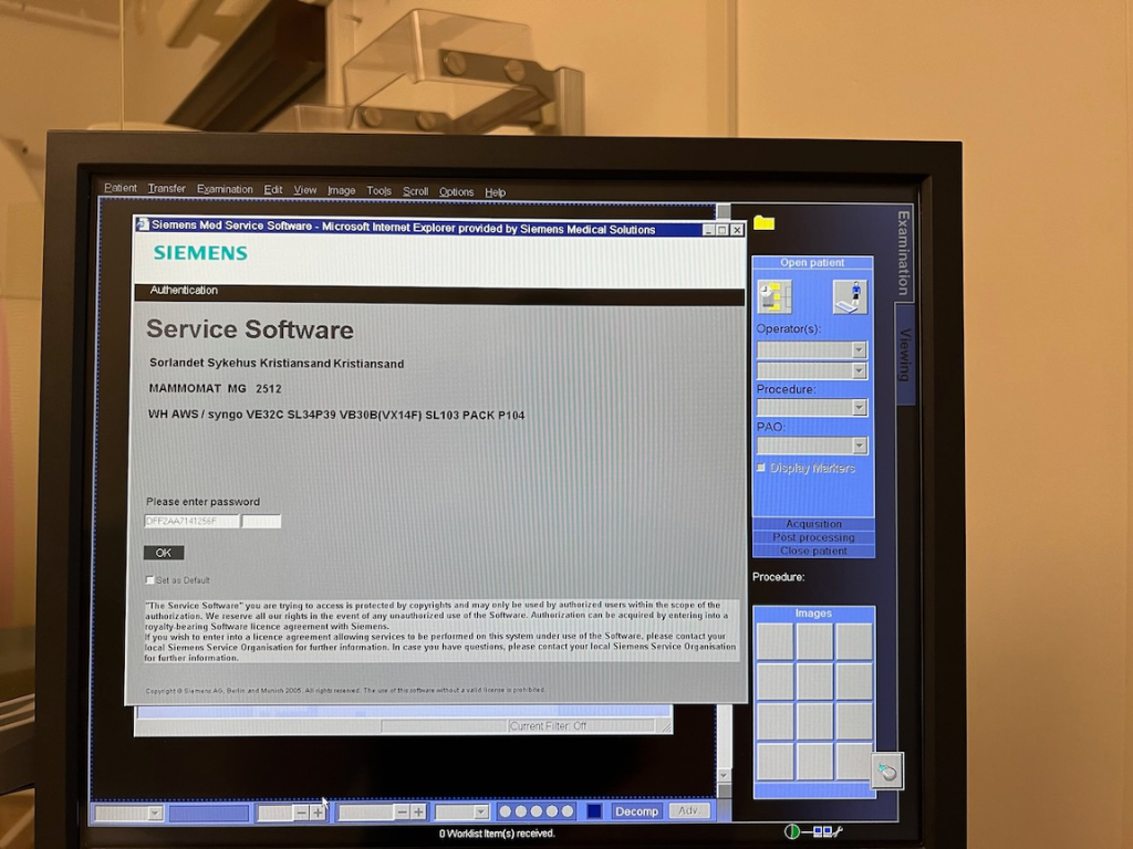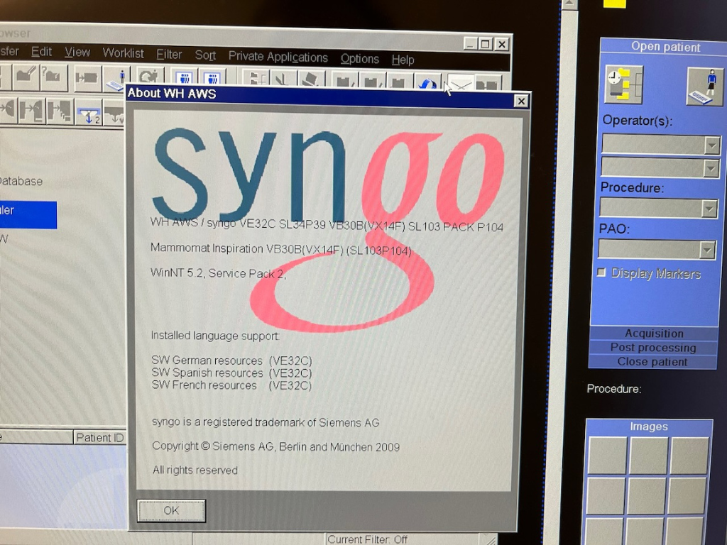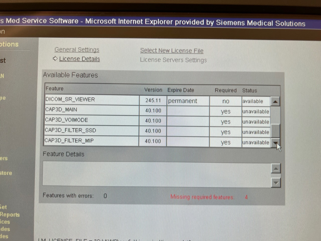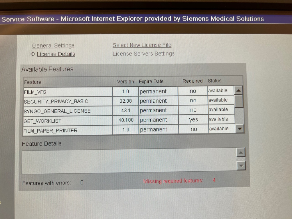 SW options console: Software options, Film VFS, Security Privacy Basic, Syngo General License, Get Worklist, Film Paper Printer, MPPS Support, DICOM SR Viewer