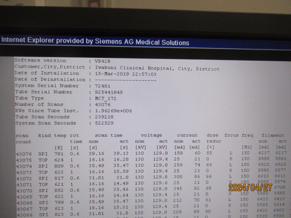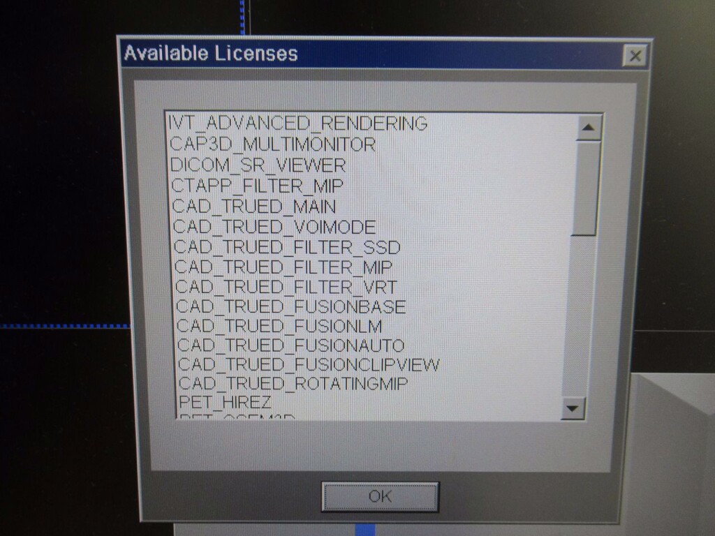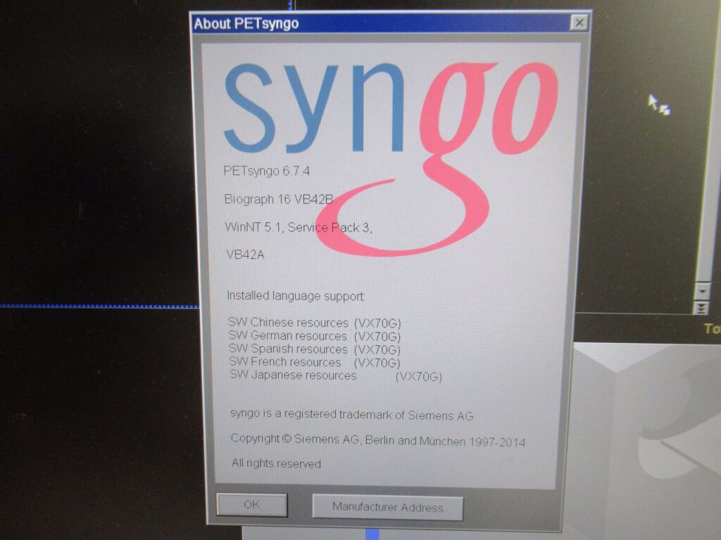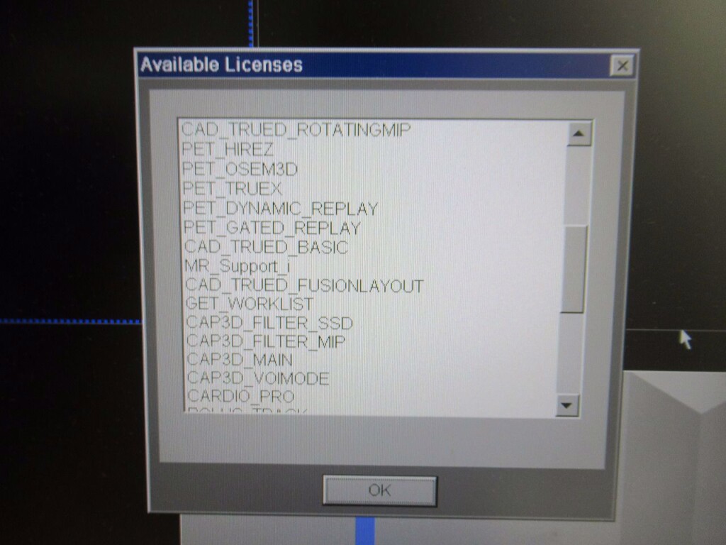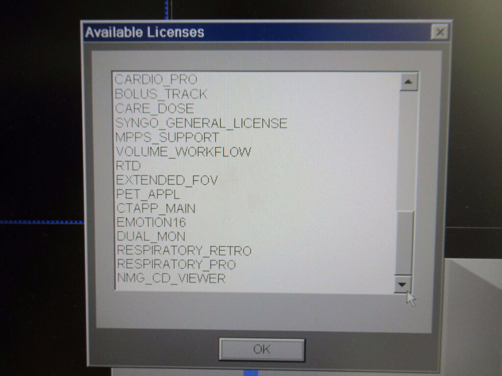 • SW options console: IVT ADVANCED RENDERING, CAP3D MULITMONITR, DICOM SR VIEWER, CTAPP FILTER MIP, CAD TRUED MAIN, CAD TRUED VOIMODE, CAD TRUED FILTER SSD, CAD TRUED FILTER MIP, CAD TRUED FILTER VRT, CAD TRUED FUSIONBASE, CAD TRUED FUSIONLM, CAD TRUED FUSIONAUTO, CAD TRUED FUSIONCLIPVIEW, CAD TRUED ROTATINGMIP, PET HIREZ, PET OSEM3D, PET TRUEX, PET DYNAMIC REPLAY, PET GATED REPLAY, CAD TRUED BASIC, MR SUPPORT I, CAD TRUED FUSIONLAYOUT, GET WORKLIST, CAP3D FILTER SSD, CAP3D FILTER MIP, CAP3D MAIN, CAP3D VOIMODE, CARDIO PRO, BOLUS TRACK, CARE DOSE, SYNGO GENERAL LICENSE, MPPS SUPPORT, VOLUME WORKFLOW, RTD, EXTENDED FOV, PET APPL, CTAPP MAIN, EMOTION 16, DUAL MON, RESPIRATORY RETRO, REPIRATORY PRO, NMG CD VIEWER,