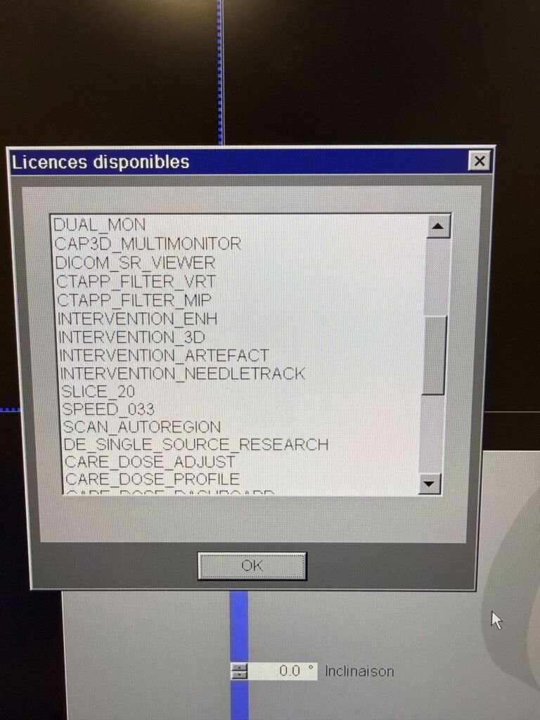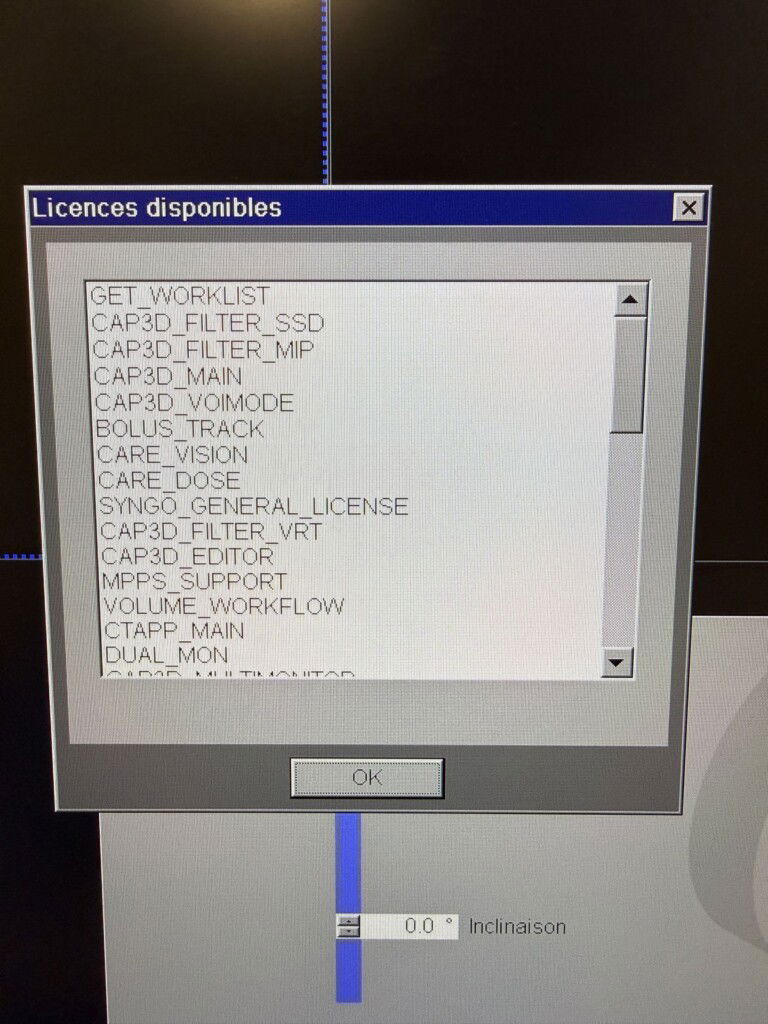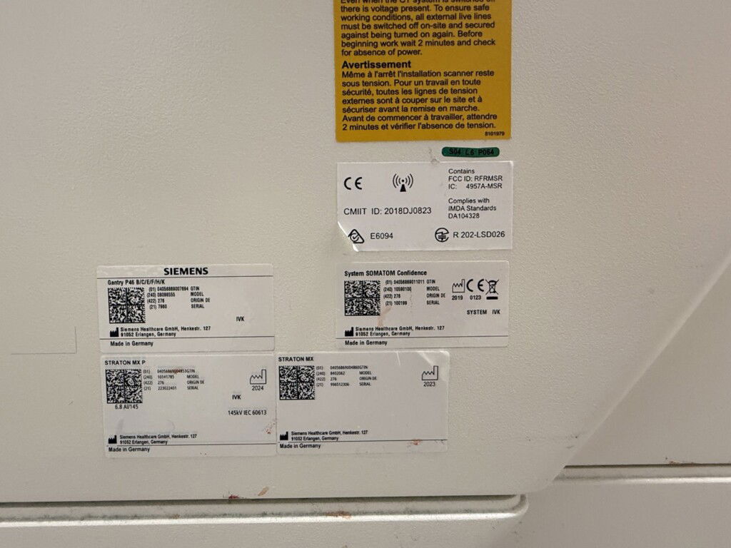 SW options console: GET_WORKLIST, CAP3D_FILTER_SSD, CAP3D_FILTER_MIP, CAP3D_MAIN, CAP3D_VOIMODE, BOLUS_TRACK, CARE_VISION, CARE_DOSE, SYNGO_GENERAL_LICENSE, CAP3D_FILTER_VRT, CAP3D_EDITOR, MPPS_SUPPORT, VOLUME_WORKFLOW, CTAPP_MAIN, DUA L_MON, CAP3D_MULTIMONITOR, DICOM_SR_VIEWER, CTAPP_FILTER_VRT, CTAPP_FILTER_MIP, INTERVENTION_ENH, INTERVENTION_3D, INTERVENTION_ARTEFACT, INTERVENTION_NEEDLETRACK, SLICE_20, SPEED_033, SCAN_AUTOREGION, DE_SINGLE_SOURCE_RESEARCH, CARE_DOSE_ADJUST, CARE_DOSE _PROFILE, CARE_DOSE_DASHBOARD, RECON_ITERATIVE_STEP2, RECON_IMAR, CTAPP_DUALENERGY_MONO_E, CONFIDENCE, VOLTAGE_70KV, CARE_DOSE_AUTOKV, RECON_SPINEREGION, SCAN_TILTEDSPIRAL, SCAN_RTP, BORE_80cm, SECURITY_USER_MANAGEMENT, SECURITY_DATA_PROTECTION, MR_Support _i, RECON_eDENSIT